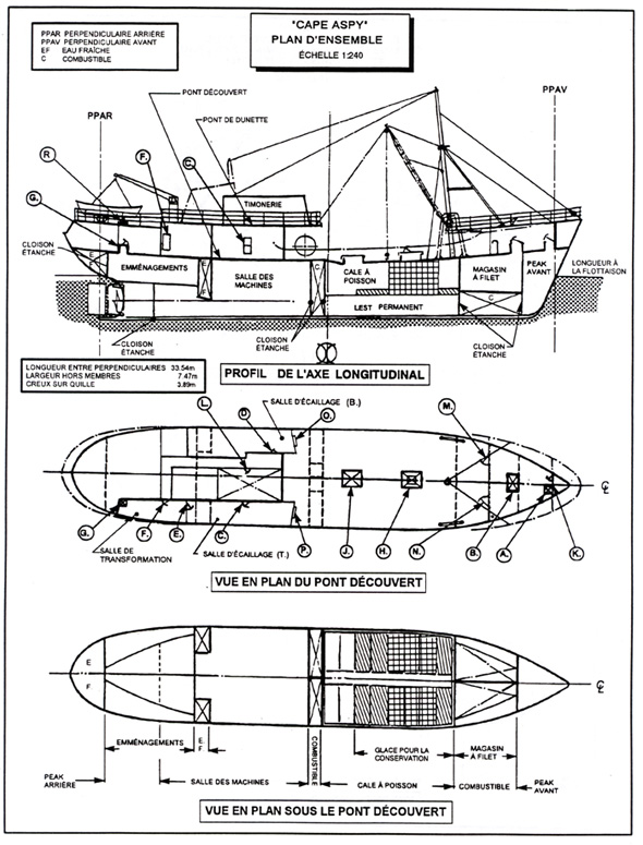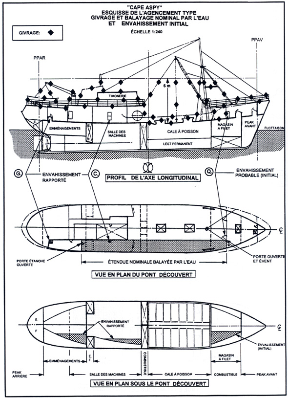 Le «CAPE ASPY» avait été construit, immatriculé et gréé pour le chalutage latéral en 1963 mais, en 1977, il avait été refondu pour la pêche aux pétoncles (dragueur de pétoncles). La coque était divisée par six cloisons étanches transversales (la photographie de l'annexe A et les croquis de l'annexe B montrent la disposition générale du navire).