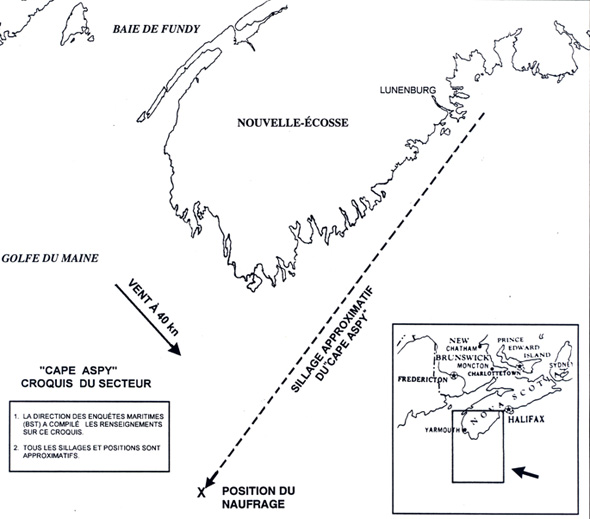 Le «CAPE ASPY» a appareillé de Lunenburg (Nouvelle-Écosse) le 30 janvier 1993 à destination des lieux de pêche du banc Georges. Environ 14 heures plus tard, par gros temps, le navire a coulé en cours de route par 120 brasses de fond par 42°28,6′N et 65°58,2′W, faisant cinq morts.