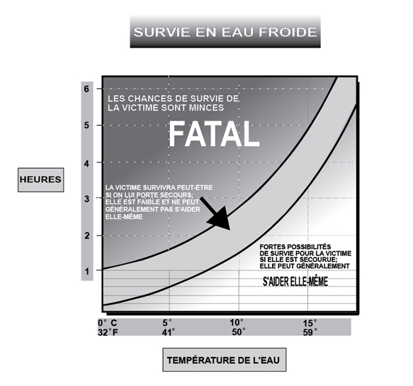 Le graphique ci-dessus donne une idée de la durée de survie d'un adulte moyen immergé dans l'eau à des températures diverses. Les données proviennent d'expériences de refroidissement effectuées en mer en gardant immobiles dans l'eau des hommes et des femmes vêtus de vêtements légers et d'un gilet de sauvetage ordinaire. Le graphique indique, par exemple, que la durée de survie prévisible est d'environ 2 heures et demie à 3 heures dans l'eau à 10°C (50°F). Cette durée est plus longue pour les personnes grasses et plus courte pour les personnes menues. Bien que les femmes soient en général un peu plus grasses que les hommes, elles se refroidissent un peu plus vite en raison de leur petite stature. Cependant, à taille égale, l'homme se refroidira plus vite.