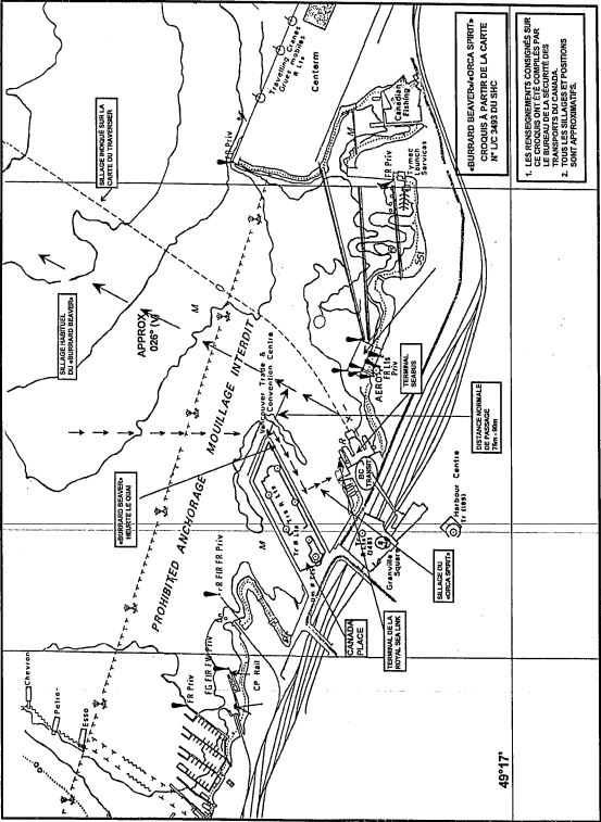 La route que le «ORCA SPIRIT» de la Royal Sea Link suit habituellement en approchant de son poste à quai apparaît sur la carte (voir l'annexe B). Lorsqu'il est en provenance du large et de First Narrows, ce traversier approche du coin nord-ouest du quai de Canada Place, puis suit une route parallèle à la face nord du quai. Ensuite, il contourne le coin nord-est et longe le côté est du quai de Canada Place. Une fois dans le bassin, il tourne et approche de son poste à quai du côté ouest du terminal SeaBus.