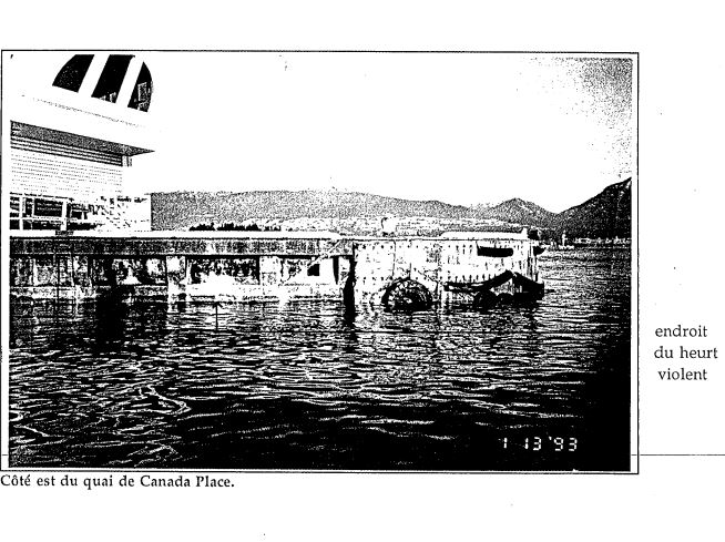 La face de béton du quai de Canada Place a été brisée légèrement et s'est écaillée au droit du point de contact (voir l'annexe C).