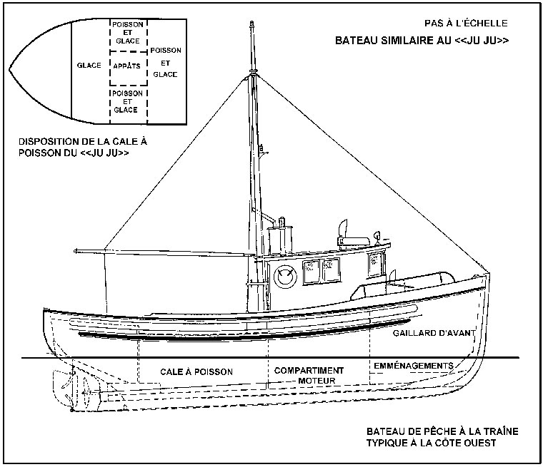 Les constructeurs du «JU JU» ne sont plus en exploitation et aucun plan de construction ou dossier de modifications apportées au bateau au fil des ans n'a pu être retrouvé. Une nouvelle timonerie avait été installée par le précédent propriétaire. Parmi de récents changements d'importance, on peut mentionner le déplacement du treuil de palangre de l'axe longitudinal au côté bâbord; l'enlèvement, de la partie avant de la cale à poisson, de trois blocs de béton servant de lest et mesurant chacun environ 762 mm x 304 mm x 106 mm; ainsi que l'installation d'une nouvelle section de pavois au-dessus du pavois existant.