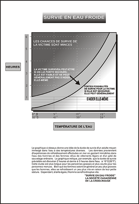 La Croix Rouge du Canada a publié un graphique illustrant les durées moyennes de survie prévisibles pour un adulte moyen portant un gilet de sauvetage standard et des vêtements légers dans l'eau de mer. Selon ce graphique, dans de l'eau à 7 °C, soit la température de la mer en l'occurrence, le temps de survie est d'environ deux heures.