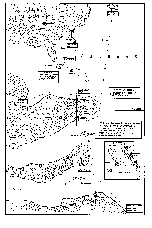 Neuf kayakistes amateurs, quatre hommes et cinq femmes, ont rencontré leurs deux guides à l'île Hotspring (C.-B.), le 26 juillet 1993 (voir le croquis du secteur à l'annexe B). Trois kayaks de type A, un kayak de type B et six kayaks de type C avaient été affrétés pour l'excursion. Cela donnait un ratio de quatre ou cinq kayakistes par guide, ce qui correspond aux normes en vigueur dans l'industrie.