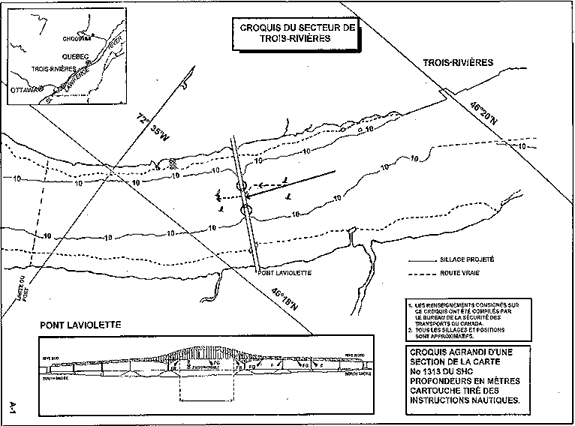 Le « DIAMOND STAR » appareille de Saint-Romuald le 9 avril 1994 à 16 h 12Note de bas de page 3, avec une cargaison de 10 000 m3 de gazole à destination de Morrisburg. Le passage de Saint-Romuald à Trois-Rivières se déroule sans incident. Le changement de pilote a lieu normalement à environ 1,5 mille en aval du pont Laviolette. Aussitôt le changement effectué, on remet la machine à « en avant toute » et on change le cap pour passer au centre du chenal, sous le pont Laviolette.