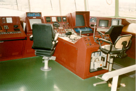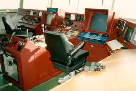 Un pupitre de commande central de navigation intégrée, en forme de T, est placé au centre, contre la cloison avant de la timonerie (voir l'annexe B). Le poste de travail situé à la gauche du pupitre est muni d'un écran radar et de nombreux interrupteurs et commandes pour les divers systèmes du navire.