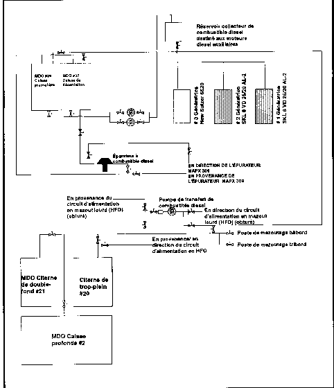 Le MDO est contenu dans la caisse profonde no 2, dans la citerne de double-fond no 21, dans la caisse de décantation no 37 et dans la caisse journalière no 39 (voir l'annexe A).
