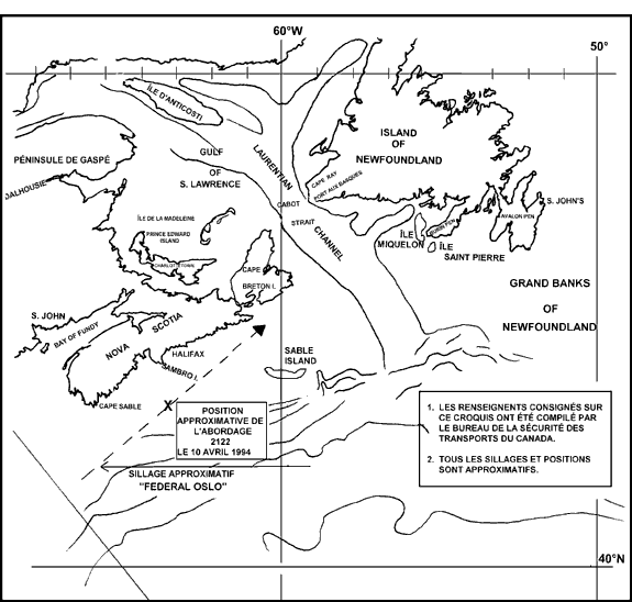 Dans la soirée du 10 avril 1994, le «FEDERAL OSLO» était sur pilote automatique et suivait une route au nord-est en direction du détroit de Cabot. La visibilité s'était détériorée pendant la soirée et, selon les témoignages, le navire faisait entendre le signal de brume approprié. Le navire conservait une vitesse de 13,5 noeuds (kn), sous la conduite de son capitaine. La seule autre personne sur la passerelle était l'officier de quart.