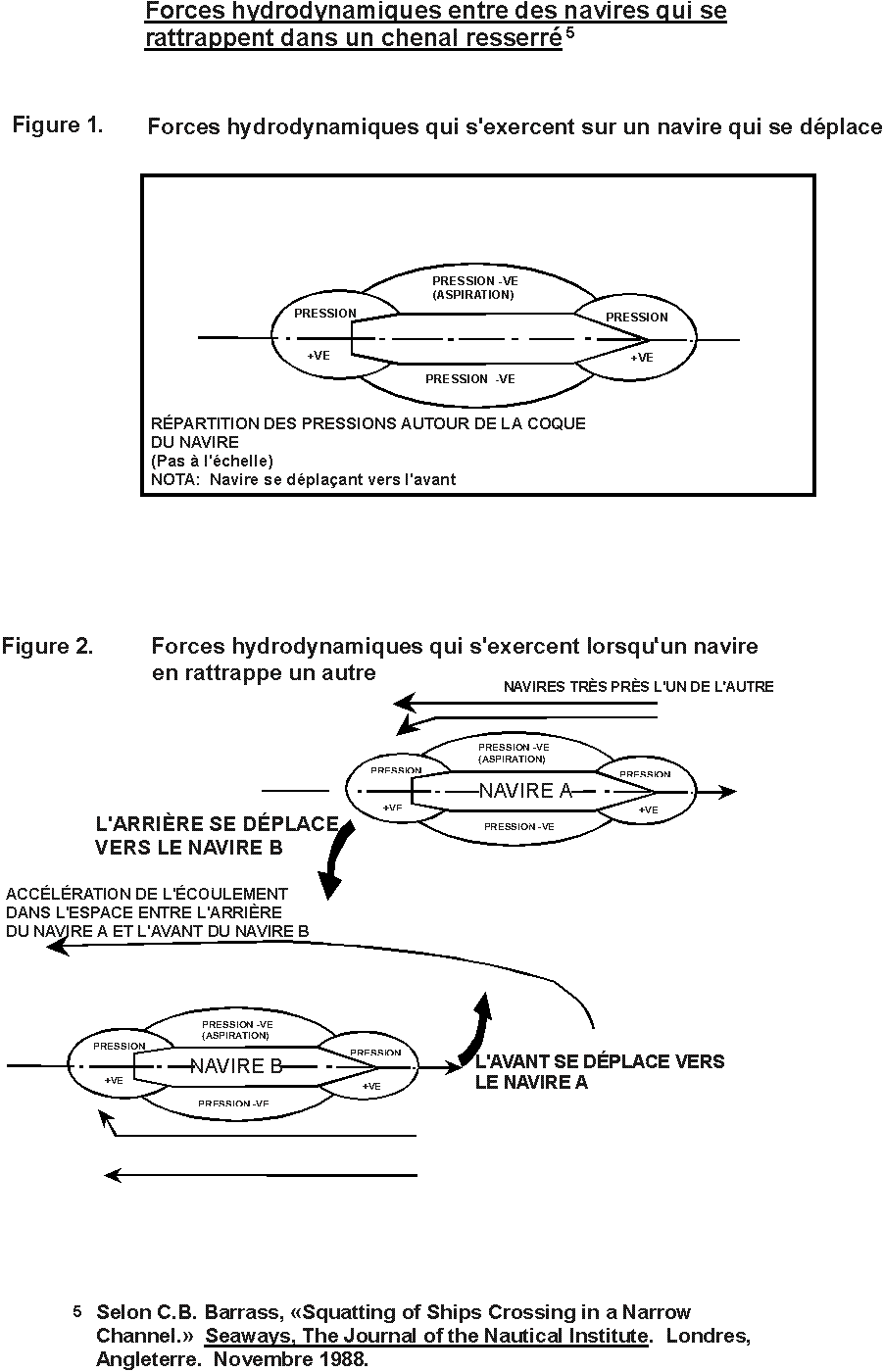 Lorsque deux navires suivent des routes parallèles ou quasi-parallèles à proximité l'un de l'autre (voir l'annexe A, figure 2), le document précité précise que tout changement dans l'équilibre précaire des forces de pression qui s'exercent sur la coque entraînera d'importantes forces longitudinales et latérales et de puissants moments de rotation s'exerceront sur le navire, ce qui pourrait nuire à la manoeuvre du navire.