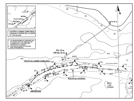 À 6 h 34, le «ZIEMIA ZAMOJSKA» a signalé au CTM son passage à la pointe des Ormes et a indiqué qu'il prévoyait passer à Yamachiche (Québec) à 7 h 35. Le «CICÉRO», qui le suivait, a signalé son passage à la pointe des Ormes à 6 h 45 et a donné une heure prévue de passage à Yamachiche de 7 h 25. Ces communications se sont déroulées normalement. À 7 h 13, le pilote du «ZIEMIA ZAMOJSKA» a signalé au CTM qu'il y avait eu abordage avec le «CICÉRO» vers 7 h 10.