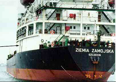 Le «ZIEMIA ZAMOJSKA» a subi des avaries limitées en-dessous de l'échelle de coupée située à l'arrière du côté bâbord et au-dessus du pont principal. Le pont supérieur a été bombé sur une longueur d'environ 2 m. Deux barres en forme de T servant au lancement de l'embarcation de sauvetage entre le pont supérieur et le pont principal ont été enfoncées et déformées. Les avaries s'étendent sur une superficie d'environ 9 m de long sur 3,5 m de large à l'endroit où la coque a été enfoncée vers l'intérieur.
