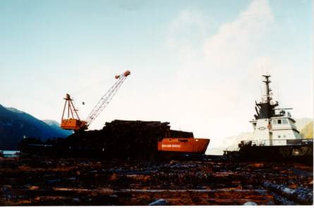 À l'aire de déchargement, deux remorqueurs d'assistance locaux aident à placer le «SEA-LINK RIGGER» à l'endroit désiré et à préparer une allingue faite de billes pour entourer les paquets de bois déversés.