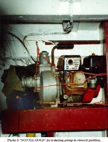 Le «SCOTIA GOLD» était équipé en conséquence, mais la pompe portable Honda de bord n'était pas dans un conteneur cylindrique conçu pour la protéger contre les intempéries comme c'est le cas pour les ensembles de pompe SAR. La pompe était à découvert et était arrimée dans un compartiment sur le pont exposé. (Voir annexe A, photo 3.)