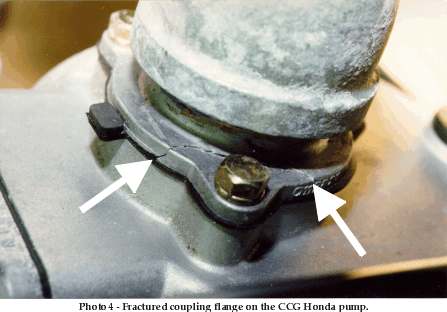 La pompe portable Honda livrée au «SCOTIA GOLD» par l'hélicoptère 361 de la GCC avait une bride d'accouplement brisée à la hauteur de son clapet d'aspiration, ce qui la rendait inutilisable. (Voir annexe A, photo 4.)