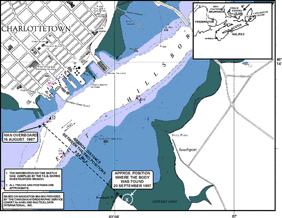Vers 20 h 45, alors que le bâtiment naviguait au large du Charlottetown Yacht Club, le capitaine a remarqué qu'un passager titubait et il a donné l'ordre au barman de ne plus lui servir d'alcool. L'affréteur a suggéré de lui servir un coke sans rhum au lieu de l'empêcher de consommer de l'alcool au bar. À ce moment, le passager avait déjà consommé trois double portions de rhum dans du coke en 40 ou 45 minutes environ. On lui avait dit de s'asseoir sur le pont du coffre, où des bancs étaient installés sur les deux côtés dans l'axe longitudinal ainsi que dans le sens perpendiculaire à l'arrière. Le capitaine a également demandé à d'autres passagers de le garder à l'oeil. Mais, 10 à 15 minutes plus tard, l'homme est tombé à la mer et le capitaine a entendu des passagers appeler à l'aide pour qu'il soit récupéré.