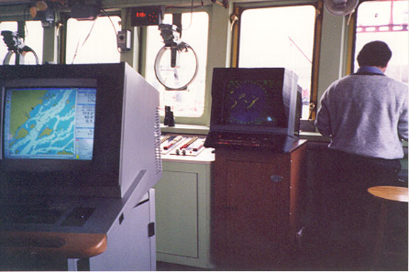 À la passerelle, il y avait une console placée à tribord de l'axe longitudinal, tout contre la cloison avant de la timonerie, où se trouvaient les commandes des machines. Le radar de tribord se trouvait à droite du pupitre. Le SCE se trouvait derrière le radar de tribord, entre le radar et la table des cartes. Il était monté sur un plateau qui pouvait pivoter sur environ 180 degrés. Le poste de barre se trouvait le long de l'axe longitudinal du navire, derrière le pupitre et à bâbord de celui-ci. Le radar de bâbord se trouvait derrière la cloison avant de la timonerie, à bâbord de l'axe longitudinal du navire.