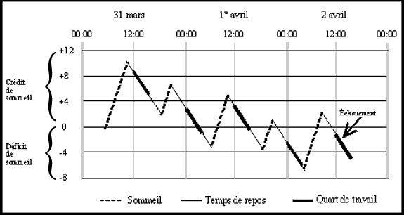 La figure 2 présente les heures de sommeil du deuxième lieutenant et donne de l'information sur le manque de sommeil accumulé qu'il accusait avant l'accident. Ces données sont basées sur l'information qu'il nous a fournie. Pour évaluer le manque de sommeil, on alloue un crédit de deux heures pour chaque heure de sommeil prise, jusqu'à un maximum de 16 heures, et on alloue un débit d'une heure pour chaque heure d'éveil.