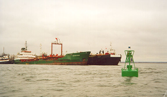 Alors que le navire suit une route au 061° et arrive à la bouée D-64, le deuxième lieutenant essaie de repérer visuellement à l'aide de jumelles la prochaine série de repères d'alignement en prévision du changement de route suivant. Le troisième lieutenant vérifie la position d'aides flottantes récemment mises en place par rapport à des amers connus. Le navire file environ 10 noeuds sur le fond dans le chenal. Il n'y a pas d'autre bâtiment dans les parages. Vers 12 h 45, le navire double la bouée D-64 et dépasse le point de changement de cap.
