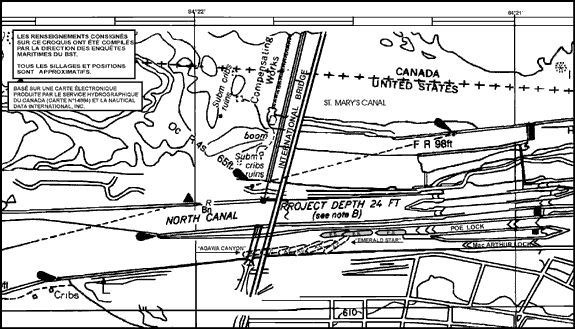 Le canal de la jetée sud-ouest sert de voie d'entrée et de sortie de l'écluse Poe et de l'écluse MacArthur. Il fait 92,65 m de largeur et sa profondeur est limitée à 8,53 m. Les écluses sont administrées et exploitées par le United States Army Corps of Engineers. Elles ne font pas partie du réseau canado-américain de la voie maritime. Le Règlement sur la voie maritime ne s'applique donc pas à ces écluses. Aucun des deux navires n'était tenu d'avoir un pilote à son bord.