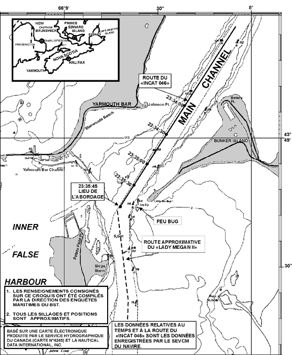 À 22 h 46, heure avancée de l'AtlantiqueNote de bas de page 2, le « LADY MEGAN II » entre en contact avec les Services de communications et de trafic maritimes (SCTM) de Saint John, connu localement sous le nom de Fundy Traffic, pour s'informer du trafic maritime dans le port de Yarmouth. On lui répond que le « INCAT 046 » est en train d'entrer dans le port de Yarmouth et qu'il doit appareiller à 23 h 15 le même soir.