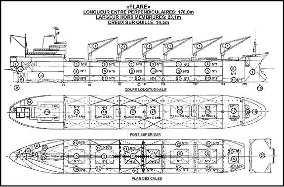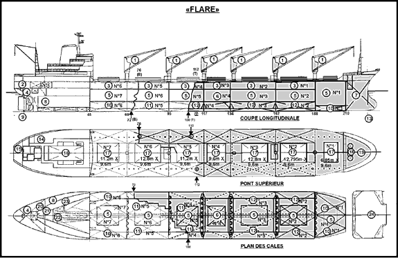 Le « FLARE » a été construit en 1972 au Japon. Il s'agissait à l'origine d'un transporteur de vrac sec à un seul pont, tout en acier. Le navire était propulsé par un moteur diesel marin entraînant une seule hélice à pas fixe. Le groupe propulseur, l'appareil à gouverner, la timonerie, l'équipement de sauvetage et les emménagements de l'équipage se trouvaient tous à l'extrémité arrière du navire. L'emplacement des sept cales à cargaison sèche ainsi que de tous les ballasts et des soutes à mazout est illustré à la figure 1, Plan d'ensemble. La coque était renforcée pour le transport de minerais, de sorte que les cales nos 1, 4 et 6 pouvaient rester vides, et que la cale no 4 pouvait être utilisée comme ballast. La coque était subdivisée par neuf cloisons étanches transversales, ainsi que par un plafond de ballast de double fond, lequel s'étendait longitudinalement au droit de toutes les cales à cargaison ainsi que de la salle des machines. Le pont principal, les citernes latérales supérieures, le plafond de double fond et le bordé de fond étaient de construction longitudinale sur toute la longueur des cales à cargaison, alors que le bordé de coque à l'intérieur des cales était de construction transversale.