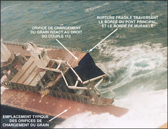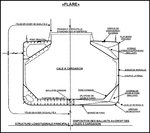 La construction de l'ensemble du navire ainsi que la disposition générale des écoutilles de chargement, des cales, des ballasts latéraux supérieurs et des citernes de double fond, de même que de la quille en caisson, étaient tel qu'illustré à la figure 2, Coupe transversale type.