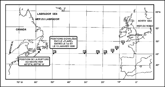 Après que le « FLARE » a quitté la Manche, les conditions météorologiques se détériorent et, le 1er janvier 1998, il navigue dans des vents d'ouest de force de coup de vent qui soulèvent de grosses lames. Dans l'espoir de trouver des conditions météorologiques plus clémentes, le capitaine décide de descendre vers le sud jusqu'au 45 de latitude nord (N) et de suivre ce parallèle en direction ouest (voir la carte 1, Traversée de l'Atlantique).