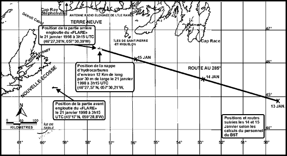 À 9 h 27, le centre des SCTM de Stephenville prévient le CSSM de St. John's que l'enregistrement de l'appel MAYDAY a été réécouté. La latitude, de 46°37′15″N, a été déchiffrée, et la longitude est possiblement de 054°W. Grâce à l'information dont il dispose, y compris la position signalée à ECAREG à midi le 15 janvier et la position de 2 h 21 fournie par INMARSAT C, le CSSM et le CCS tracent la route que le « FLARE » a dû suivre pour intercepter la latitude déchiffrée de 46°37′15″N, et obtient un point d'intersection au 058°W. La position INMARSAT C de 2 h 21 est également déplacée sur la route présumée du navire vers le cap Ray afin d'obtenir la position du navire six heures plus tard, soit à l'heure de l'appel MAYDAY. La position ainsi obtenue est aussi au 058°W.