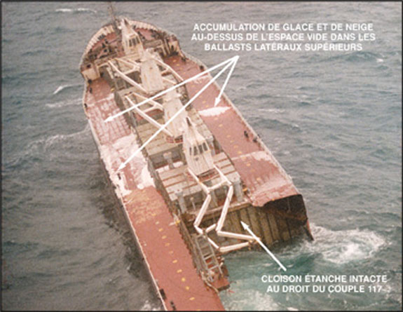 Le 13 janvier, la route du navire est modifiée pour s'approcher du dispositif de séparation du trafic recommandé dans le golfe du Saint-Laurent (voir la carte 2, Secteur de l'accident). Alors que le navire approche des côtes du Canada, le capitaine signale au Système de trafic de l'Est du Canada (ECAREG) que les tirants d'eau avant et arrière du navire sont respectivement de 11 pieds (3,35 m) et 21 pieds (6,4 m). Il indique aussi que l'eau de mer servant de lest liquide a été changée les 10, 11 et 12 janvier. Le 14 janvier, les armateurs du navire demandent au capitaine de s'assurer que tous les ballasts sont pleins afin d'atteindre le tirant d'eau maximal permis pour éviter d'endommager l'hélice dans les glaces. Le capitaine leur répond qu'il a déjà signalé à ECAREG que les ballasts sont pleins.