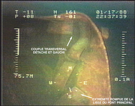 Vers 0 h, heure du navire (4 h en temps universel coordonné [UTC]Note de bas de page 3), le 16 janvier, on entend un boum retentissant (causé par le claquement du brion), suivi d'une flexion longitudinale et d'un fouettement importants de la coque. Environ quatre heures et demie plus tard, un autre bruit particulièrement fort se fait entendre, lui aussi suivi d'un violent fouettement et de fortes vibrations de la coque.