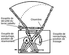 Les crocs aux extrémités de l'embarcation de sauvetage s'insèrent dans des ferrures d'appui, et, une fois les crocs dégagés, le poids de l'embarcation fait pivoter les crocs en position ouverte.Le mécanisme de verrouillage des crocs en mode de hissage est constitué de cames et de cliquets. Le réglage des cames et des cliquets est commandé par des câbles Bowden reliés au mécanisme de largage qui se trouve le long du tambour machines, sous le siège du patron d'embarcation. Le mécanisme de manoeuvre est composé d'un secteur qui pivote jusqu'à mi-longueur environ, exerçant une traction sur les câbles Bowden, lesquels, à leur tour, escamotent, à l'avant et à l'arrière, un levier de came, ce qui fait sortir le cliquet du croc. Le secteur est aussi percé de deux trous, et une goupille de sécurité s'y insère pour verrouiller le secteur en position de hissage ou en position de réarmement. Le secteur est actionné par un levier qui fait saillie au-dessus du plancher de la cabine mais qui est muni de charnières permettant de le replier dans le plancher quand on ne s'en sert pas. Il faut enlever la goupille de sécurité qui bloque le secteur en position de hissage avant que le levier puisse être actionné pour ouvrir les crocs; le bras long du levier est maintenu en position rabattue par une autre goupille de sécurité.