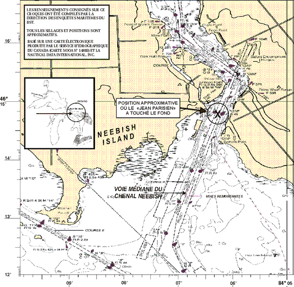 Le 23 avril 1999, le vraquier canadien « JEAN PARISIEN » naviguait sur lest et remontait la rivière St. Marys avec un tirant d'eau arrière maximal de 7,0 m. À 18 h 15, le fond du navire a touché le fond de la rivière dans un secteur où la profondeur projetée était de 6,4 m, dans la voie médiane du chenal Neebish. L'arrière du navire venait de passer devant les bouées Q16 et Q17 quand le personnel de navigation de la passerelle a ressenti un impact qui a secoué le navire et a observé un tourbillon boueux dans l'eau sur l'arrière du navire. Après que l'équipage eut fait une inspection initiale pour déterminer l'étendue des dégâts, le navire a poursuivi sa route jusqu'à Sault Ste. Marie, où il a fait l'objet d'une inspection de la carène. L'inspection a révélé une brèche dans le bordé de fond, qui a causé une altération de l'étanchéité à l'eau.