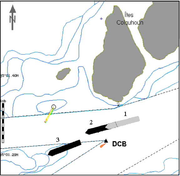 Le pilote, après avoir entendu l'ordre « à droite toute », vient aider l'apprenti-pilote. L'apprenti-pilote demande alors au pilote s'il faut mettre l'allure à « en arrière toute ». Le pilote acquiesce, et l'ordre est donné. L'officier de quart transmet l'ordre au transmetteur d'ordres. L'apprenti-pilote demande ensuite à l'officier de quart d'appeler la salle des machines pour avoir « d'urgence en arrière toute ». L'officier de quart fait l'appel et, peu après, la machine principale fonctionne à « en arrière toute ». Vers 11 h 55, le navire s'échoue sur un haut-fond de 4,8 m sur la bande sud du chenal de Cornwall, une encablure en amont de la bouée DCBNote de bas de page 4. Le cap est de 249 °(G) et le navire accuse une légère gîte sur tribord d'environ un demi-degré. Le capitaine, qui est arrivé dans la timonerie depuis peu, stoppe la machine principale.