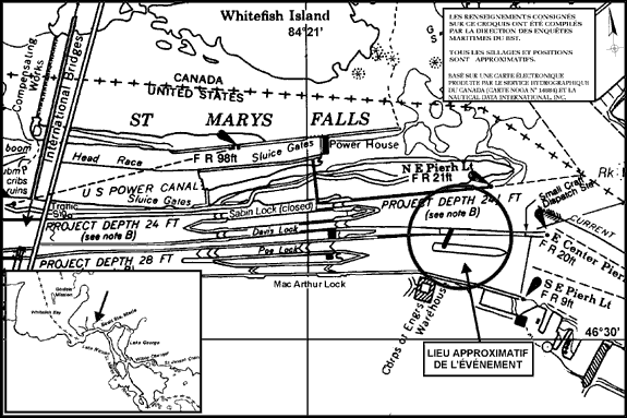 Avant d'arriver aux écluses de Sault Ste. Marie, le navire prend une gîte d'un degré et demi sur bâbord. Préoccupé par le faible niveau d'eau dans la rivière St. Marys ainsi que par l'augmentation de 10 cm du tirant d'eau provoqué par la gîte, le capitaine ordonne au deuxième lieutenant de relever le mât de déchargement et de le faire pivoter vers tribord au moment où le navire quitte l'écluse Poe à 2 h 25 le 9 juin. On espère ainsi faire déplacer vers tribord le lest liquide qui reste à bord dans le ballast no 3 de bâbord, ce qui corrigerait la gîte. Cependant, dès que le mât quitte son socle, il commence à pivoter sur bâbord. Malgré les tentatives du deuxième lieutenant pour arrêter sa course au moyen de la commande du mécanisme d'orientation, le mât continue de pivoter vers l'extérieur jusqu'à ce qu'il touche l'avant des emménagements sous un angle de 90 degrés par rapport au navire.