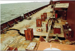 La citerne à trémie no 2 de tribord et la citerne à trémie no 3 de bâbord qui étaient utilisées comme citernes de ballast ont été perforées lors du premier échouement. Par la suite, la coque a subi d'autres avaries importantes (B 1.3, Rupture de la coque).