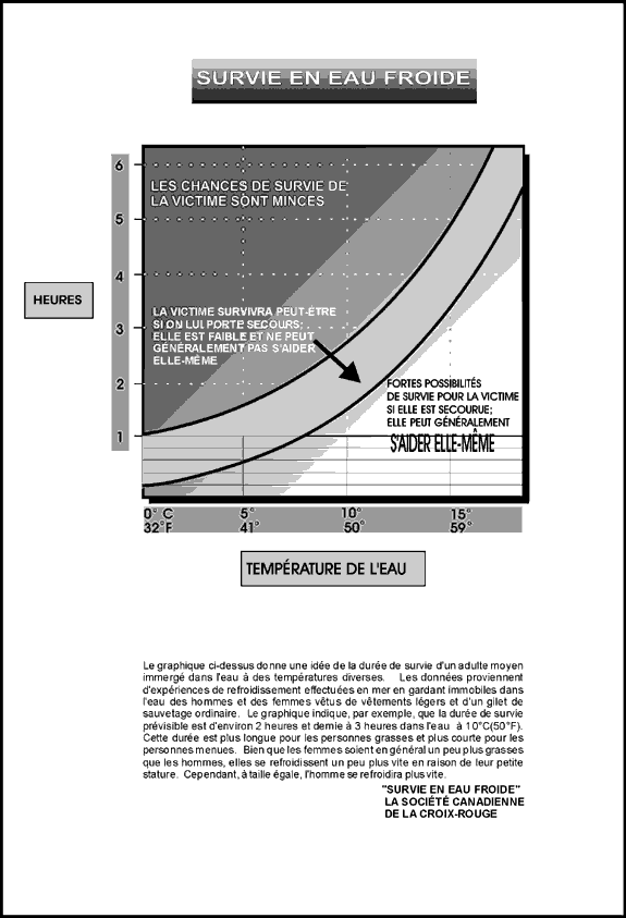 Les survivants ont indiqué qu'ils avaient passé environ 20 à 25 minutes dans l'eau à une température de neuf degrés Celsius (°C). Ils ne souffraient pas d'hypothermie et n'ont pas eu besoin de soins médicaux après avoir été repêchés. Selon le Graphique de la survie en eau froide de la Croix-Rouge canadienne (voir l'Annexe B), une personne portant un gilet de sauvetage ordinaire et des vêtements légers dans de l'eau à 8 à 10°C a une espérance de survie de deux à trois heures avant de succomber à l'hypothermie.