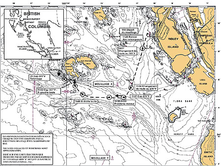 Vers 1 h 49, on met la barre à droite toute dans l'intention de revenir sur un cap à l'est pour regagner le mouillage «X». À 1 h 49, l'OQ relève la position du navire au GPS (système de positionnement global) et au radar et note que le navire se trouve alors par 54° 11,32′ N et 130° 22,22′ W, à 5,8 encablures de la pointe sud de l'île South Kinahan.