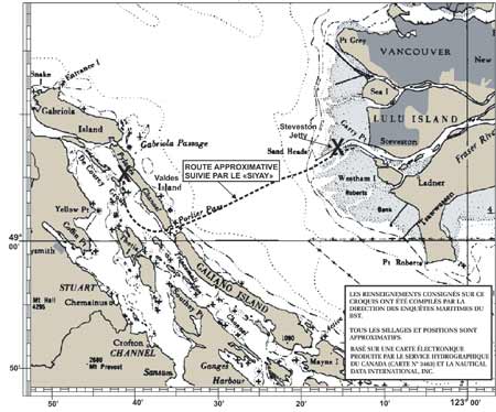 Le CCOS leur a demandé de rechercher une embarcation de plaisance qui se serait échouée à 0,25 mille au sud-est (en aval) de Steveston, dans le bras sud du Fraser. Le Siyay s'est engagé dans le Fraser à la hauteur de Sand Heads à 24 h, du côté sud de la digue Steveston. En route vers Steveston, ils ont patrouillé le fleuve le long de la digue à l'aide de leur projecteur. Plus tard, lorsque le CCOS l'a informé que l'embarcation se trouvait du côté nord de la digue, le capitaine a viré de bord et s'est dirigé vers l'ouest le long de la digue. Il y a de nombreuses brèches dans la paroi de la digue et le capitaine a décidé de passer à travers l'une de ces brèches, située entre les balises 7 et 7A, pour atteindre le côté nord le plus rapidement possible. L'autre option consistait à se rendre jusqu'à Sand Heads pour contourner l'extrémité de la digue, ce qui aurait pris plusieurs minutes supplémentaires.