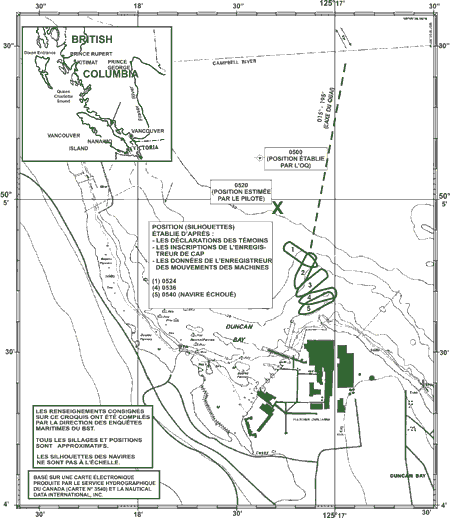 Un peu après 4 h le 17 août, le navire s'engage dans la passe Seymour. Après avoir dépassé Race Point à 4 h 36, le pilote commence à naviguer à vitesse réduite pour ne pas arriver aux abords du mouillage avant 6 h (les préposés aux amarres n'étant pas disponibles avant cette heure). Le timonier gouverne le navire manuellement; le capitaine et l'officier de quart (OQ) se trouvent également dans la timonerie.
