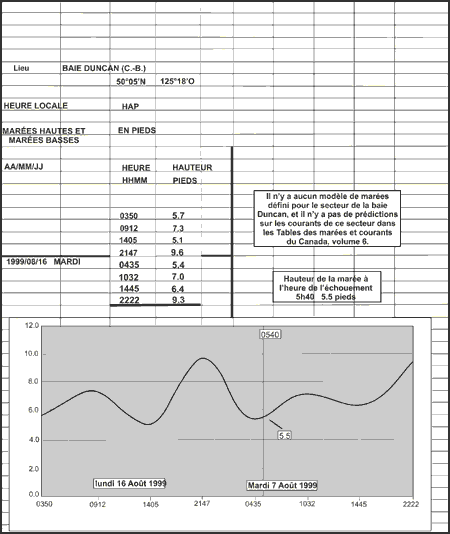 D'après les Tables des marées et courants du Canada, volume 6, la marée était montante dans la baie au moment de l'accident, la marée basse étant prévue pour 4 h 35, et la marée haute pour 10 h 32 (voir l'annexe B). Cela donne à penser que la marée commençait à monter; toutefois, d'après l'information obtenue auprès du SHC, le débit du courant dans le passage Discovery dépend de la différence du niveau d'eau entre le détroit de Georgia et le détroit de Johnstone. La relation entre le niveau d'eau de la baie Duncan et le courant du passage Discovery est complexe et imprévisible; on ne peut pas utiliser l'état de l'un pour déduire l'état de l'autre.