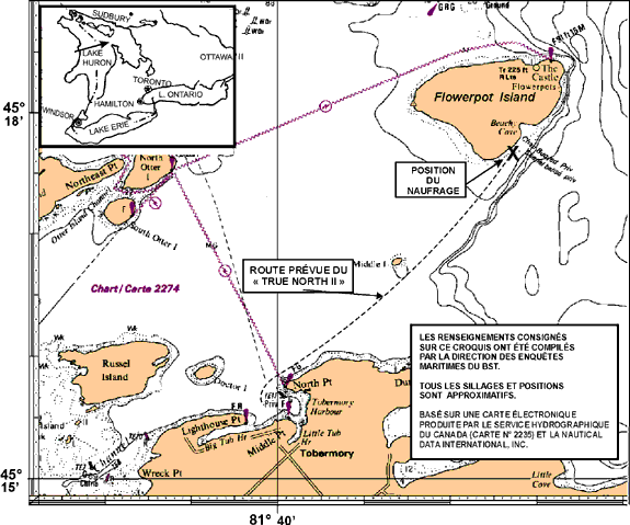 Le 16 juin 2000, pendant qu'il rentrait Tobermory (Ontario) en provenance de l'île Flowerpot, dans la baie Georgienne (Ontario), sur des eaux agitées et dans des conditions météorologiques modérées, le petit navire à passagers « TRUE NORTH II » a été balayé par une série de vagues qui ont enfoncé la porte avant de la superstructure, envahi le pont principal et pénétré dans la coque par les hauts. Le navire a coulé rapidement dans 15 mètres d'eau, à quelque 200 mètres de l'île Flowerpot vers 10 h 30 heure locale. Des 20 personnes qui étaient à bord, 18 ont dérivé jusqu'au rivage, portées par deux engins flottants. Deux écoliers de septième année ont péri noyés.