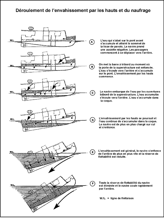 En raison de cette obstruction, et des deux sabords de décharge près du milieu du navire, dont on avait obturé par soudage les volets d'évacuation, la capacité d'évacuer l'eau embarquée sur le pont principal était réduite (voir les photos 6 et 7).