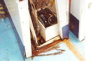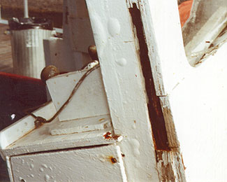 Le bordé du pont principal montrait une corrosion considérable sur le pourtour d'une ouverture de forme irrégulière donnant accès aux commandes du moteur principal, à l'appareil à gouverner et aux fils électriques qui étaient à l'intérieur du pupitre de bois construit au poste de commande. Par cette ouverture, l'eau embarquée qui s'est accumulée sur le pont principal a pu s'écouler dans le compartiment sous le pont.