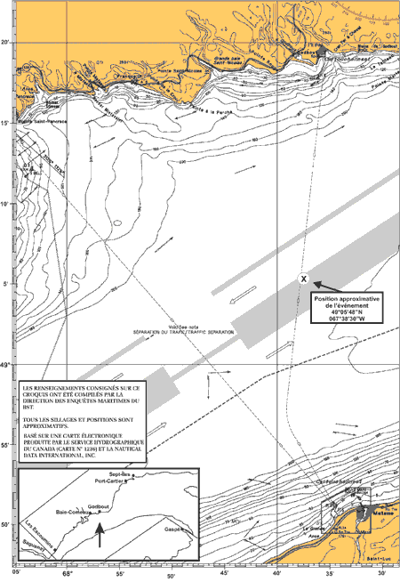 Avant le changement de quart vers 12 hNote de bas de page 2, au large de Pointe-des-Monts, le capitaine appelle le centre des Services de communication et de trafic maritimes (SCTM) de Les Escoumins pour signaler que le navire a dépassé le point d'appel 2A. Entre temps, le troisième mécanicien va rejoindre le quatrième mécanicien dans la salle des machines.