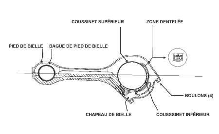 - Effectuer un contrôle par ressuage de la zone dentelée de la coupe de bielle et du chapeau pour la bielle à coupe oblique. Toute fissure doit être examinée par le constructeur, lequel déterminera s'il faut mettre au rebut l'ensemble bielle-chapeau.