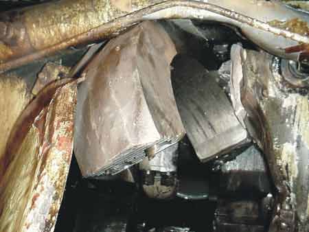 La tête de la bielle no 3 a perforé le côté droit de la machine, causant des dommages au bâti et à la porte d'inspection du bloc-cylindres no 9. Les conduites d'huile de lubrification et d'eau de refroidissement et l'accouplement flexible ont également été endommagés (photo 2).