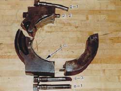 L'inspection de la machine principale a révélé que la bielle s'était détachée du piston no 3Note de bas de page 3. La couronne du piston était détachée de la jupe, laquelle s'était brisée en plusieurs morceaux. Le vilebrequin était gauchi au droit du palier principal no 4 . La soupape d'échappement et les poussoirs des soupapes d'échappement et d'admission de la culasse no 3, étaient aussi gauchis. Le contrepoids no 6 et le pied de bielle no 3 étaient coincés entre le maneton de bielle et le dessous de la chemise et du bâti (figure 1).