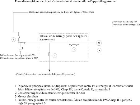 Les circuits et moteurs précités doivent être protégés contre les courts-circuits et équipés d'une alarme de surcharge. Les dispositifs de protection contre les surintensités, y compris les courants de démarrage, lorsqu'il en existe, doivent entrer en action lorsque le courant est au moins égal au double du courant à pleine charge du moteur ou du circuit protégé et être conçus de manière à laisser passer les courants de démarrage appropriés.