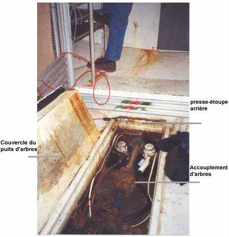 - L'enlèvement du couvercle du puits d'arbre pour travailler sur le presse-étoupe a aussi découvert l'accouplement de l'arbre en rotation dans lequel s'est accroché et pris l'ourlet du pantalon de pluie du propriétaire/patron.