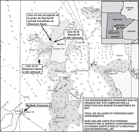 Le Shannon Dawn a été retrouvé chaviré et envahi par l'eau à environ quatre milles marins au sud-sud-ouest du lieu où le transfert d'un bateau à l'autre a été fait. On a trouvé deux VFI sur la rive sous le vent de l'île Berens, près de l'endroit où le Rachel M a été retrouvé, ce qui donne à penser que lorsque le Shannon Dawn a pris à son bord les deux pêcheurs du Rachel M et leur cargaison de poisson, les deux pêcheurs du Rachel M ont laissé leurs gilets de sauvetage / VFI dans leur bateau.